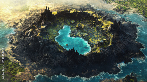 A dramatic top-down view of an isolated volcanic peninsula extending into a tranquil blue lagoon, surrounded by a vast, soft beige background