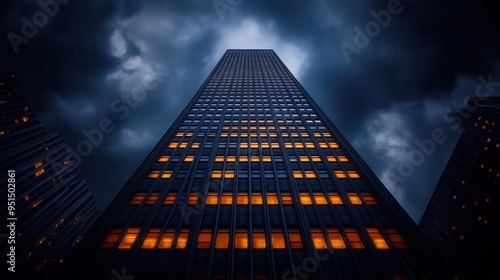 A dramatic view of a towering skyscraper illuminated against a moody evening sky, showcasing urban architecture and atmosphere.