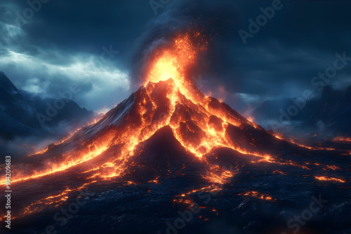 A dramatic volcano erupting with lava flows under a dark, stormy sky, showcasing the raw power of nature's forces.