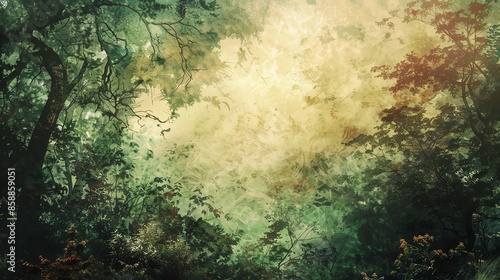 A dreamy, abstract forest scene with a textured background and soft light filtering through the trees.