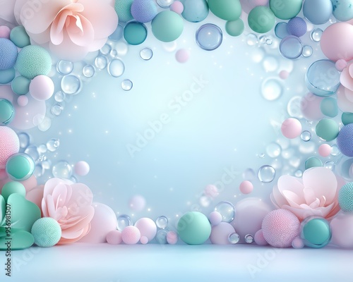 A dreamy backdrop featuring soft pastel flowers and bubbles, perfect for celebrations or creative projects.