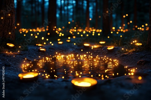 A dreamy forest clearing, with fireflies glowing softly around a small pond, creating an ethereal, otherworldly mood