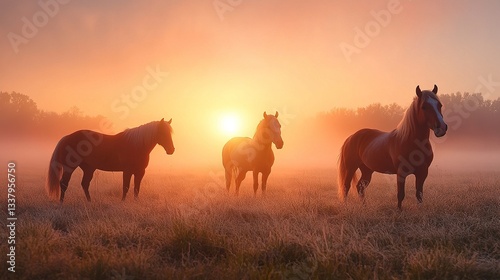 A dreamy upstate NY sunrise as horses roam a cold pasture, their forms softened by morning mist, with the sky ablaze in soft oranges and pinks, cinematic telephoto shot