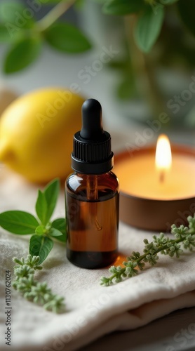 A dropper bottle of essential oil sits beside a burning candle, lemon, and fresh herbs, creating a serene aromatherapy setting