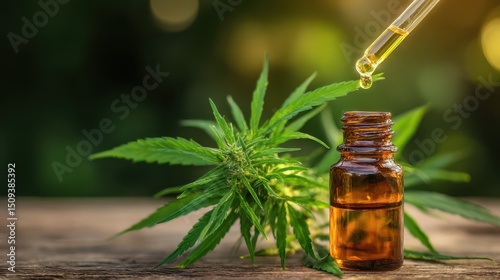 A dropper filled with cannabis oil hovers above a small glass bottle, surrounded by fresh cannabis leaves in a natural outdoor environment. Sunlight creates a warm glow
