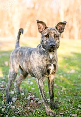 dog, brindle, mixed breed, standing, shepherd, alert, animal, attentive, breed, canino, ear, listen, listening, look, looking, mutt, outdoors, pet, pet, racked, watchful, watching