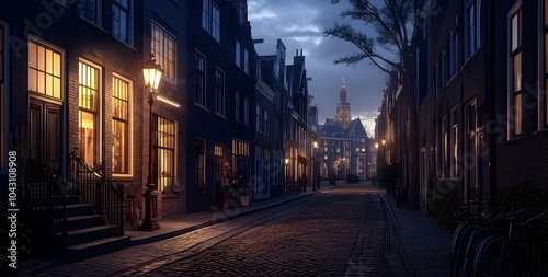 dutch, street, city, old, house, cobbled, street, night, light, evening, sky, photo, cinematic, scene, style, skilled, photographer