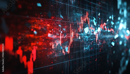 A dynamic abstract representation of financial data visualizations featuring red and blue tones amidst a digital backdrop.