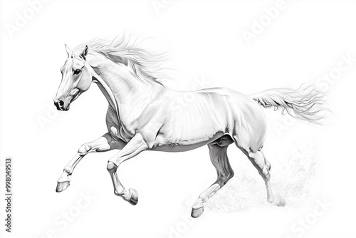 A dynamic black-and-white illustration of a powerful horse in full gallop, kicking up dust behind it