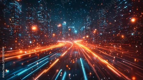 A dynamic cityscape with vibrant light trails depicting futuristic energy and motion amidst tall skyscrapers in a starry night environment.