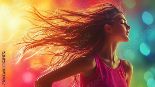 A dynamic photo of a girl flipping her shiny, flowing hair in motion, the strands creating a wave-like effect, captured in mid-air with a vibrant backdrop