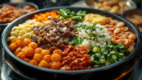A dynamic street food scene with a vendor preparing Shabu Shabu in a busy market.