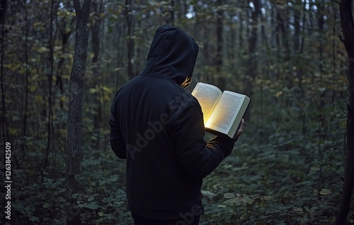 A faceless man under a hood peruses a book, with light rays issuing from it