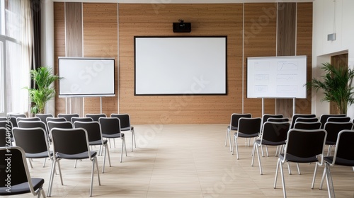 A factory with a focus on its employee training room, featuring whiteboards and presentation screens. Product photography with high resolution, advertising style