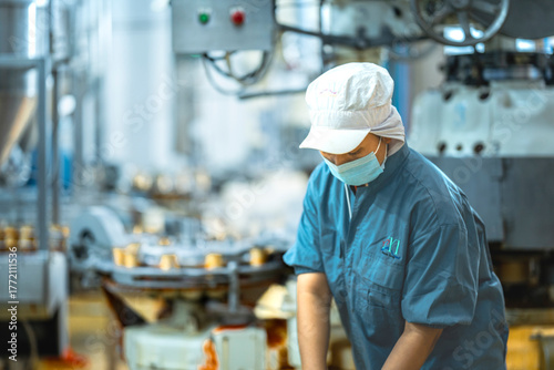 men at work, factory, industry, manufacturing, production, line, assembly, conveyer, belt, machine, machinery, food, processing, equipment, steel, metal, uniform, hairnet, cap, mask, hygiene, sterile, quality, control, monitoring, professional, specialist, indoor, modern, clean, plant, filling, packing, cardboard box, liquid, sauce, beverage, product, technology, automatic, automated, tied-up, work, safety, ai, smartphone, can, operator, back