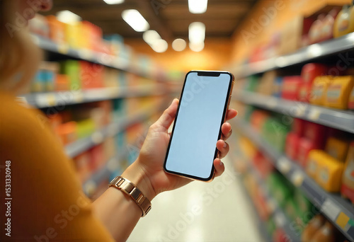woman, female, smartphone, phone, blank, screen, holding, hand, fair, skin, gold, watch, supermarket, aisle, shopping, store, modern, casual attire, technology, display, electronic, retail, lifestyle, digital, communication, device, checkout, client, indoor, light, product, buying, market, shelf, consumer, fashion, style, realistic, gesture, browse, navigation, choice, shopper, e-business, touch screen, wearable, accessory, bright, clean