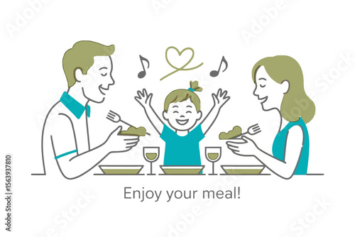 A family dinner illustration with a man woman and child at a table with a heart and music note above them