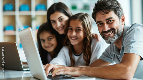 family, laptop, children, smiling, teamwork, living room, together, bonding, technology, education, activity, girl, joy, happiness, creative, leisure, afternoon, fun, lifestyle, furniture, collaboration, communication, present, casual attire, home, interaction, sibling, connection, learning, friendship, parenthood, modern, cheerful, digital, engaging, light, social, atmosphere, candid, indoor, playful, youth, sharing, involvement, enjoyment, productivity