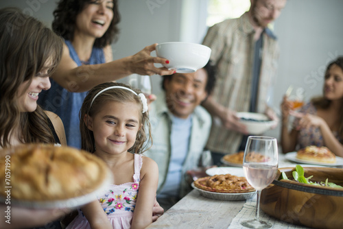 collecting, sitting, standing, holding, female, woman, girl, male, man, family, enjoyment, fun, festivity, togetherness, well-being, side by side, laughing, mouth open, smiling, party, social gathering, reunion, us, new york city, candid, waist up, horizontal, photo, front view, half face, tilt, selective focus, food, meal, dessert, pie, bowl, residential structure, house, indoor, day, domestic life, food and drink, human relationships, lifestyle, healthy lifestyle