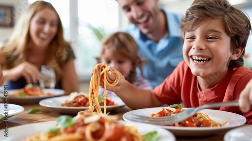A family having a pasta dinner, with everyone laughing and enjoying the meal