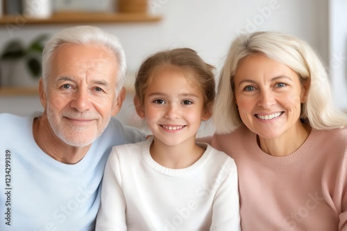 A family of different ages sitting in a semi-circle, smiling warmly, soft lighting creating depth, studio setup.