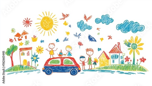 A family of stick figures with their child, surrounded by colorful drawings like flowers, clouds, houses, cars, trees, suns, and birds in the sky, isolated on a white background.
