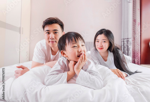 A family of three in the bed in the bedroom