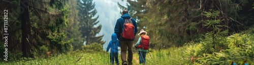 A family of three is hiking in the forest, with tall trees and green grass on both sides Generative AI