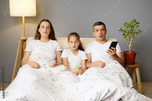 A family of three sits on a bed in their cozy living room, wrapped in blankets, displaying surprise while watching a suspenseful movie together. The atmosphere is relaxed and engaging