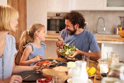 A family sits around a table, sharing a meal in a welcoming kitchen. A father offers a salad to his daughter, while others enjoy their dishes, creating a joyful atmosphere.