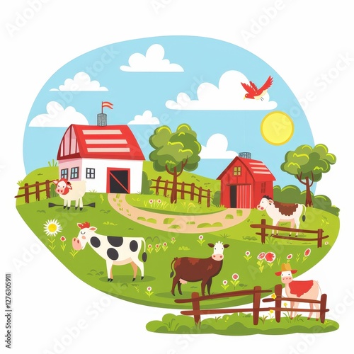 farm, cow, barn, house, grazing, field, fence, area, farmland, nature, agriculture, vector, rural, illustration, countryside, cartoon, grass, landscape, design, meadow, green, animal, background, summer, sky, country, drawing, land, graphic, village, pig, horse, sheep, hill, scenery, harvest, windmill