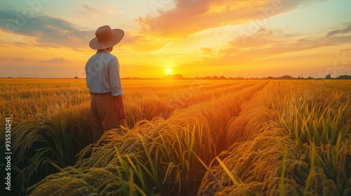 farmer, sunset, rice, field, agriculture, landscape, nature, harvest, sky, cloud, calmness, rural, growth, crop, environment, sun, peace, horizon, gold, evening, serenity, labor, earth, cultivation, beauty, work, season, plant, dirtied, sunshine, warmth, scenery, productivity, tradition, community, country, livelihood, dusk, hope, abundance, sustainability, farming