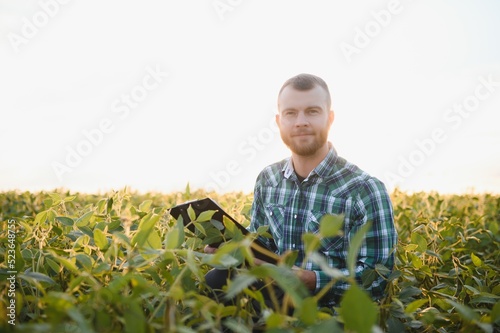 A farmer agronomist inspects green soybeans growing in a field. Agriculture