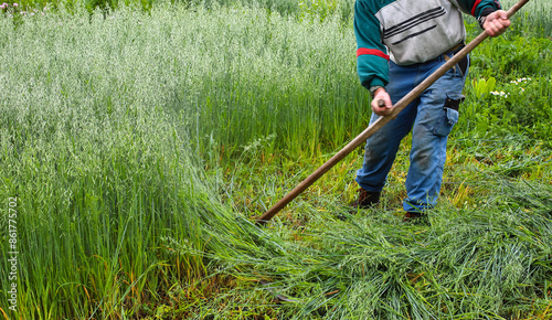 A farmer mows grass with a hand scythe, foraging in the countryside. A mature farmer mows young green rye for cattle feed.