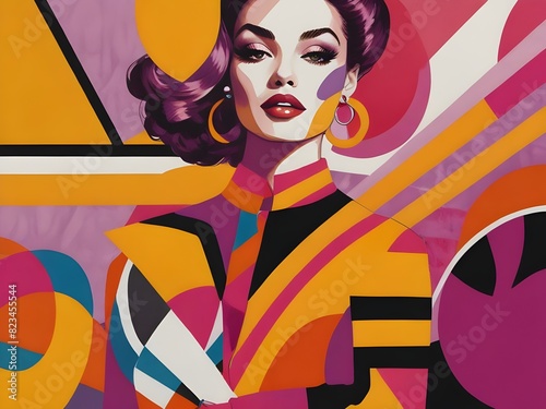 A fashion illustration in the style mix of bold graphic illustrations and watercolor, posing for the camera colorful shapes and curves in orange, pink, purple and yellow colors. Generative AI