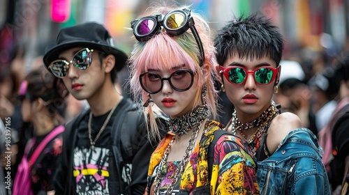 A fashion-forward crowd in Tokyo's Harajuku district, showcasing avant-garde and eccentric styles that push the boundaries of fashion