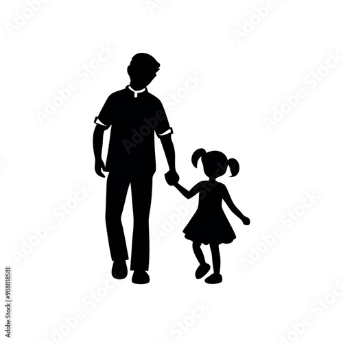 a father and daughter walking hand in hand. The father is on the left side of the image, with his back to the viewer, and the daughter on the right side