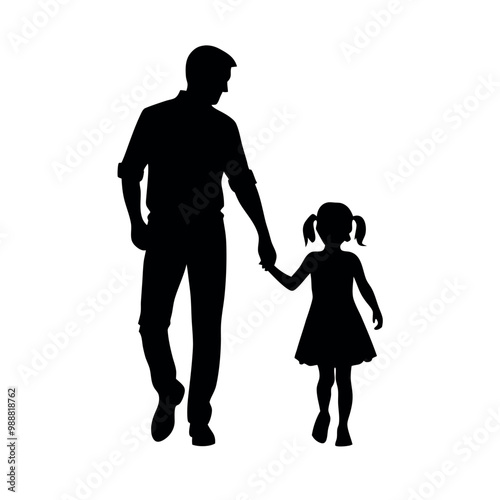 a father and daughter walking hand in hand. The father is on the left side of the image, with his back to the viewer, and the daughter on the right side