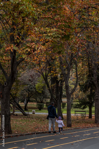 A father and his daughter taking a walk in a park alley. Autumn colours season mood.