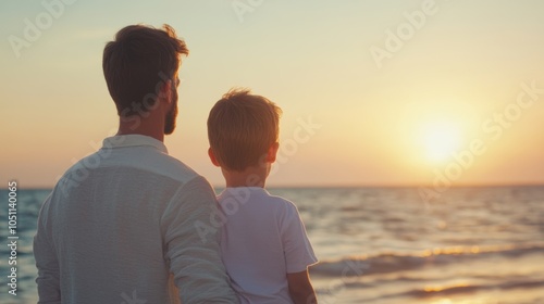 A father and son stand beside each other at the shoreline, watching the sunset over the calm sea and sharing a special moment