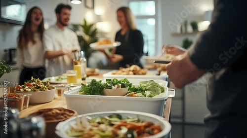 A Feast of Joy: A lively gathering of friends and family, a culinary symphony of shared joy, with the kitchen counter showcasing a wide array of delicious food