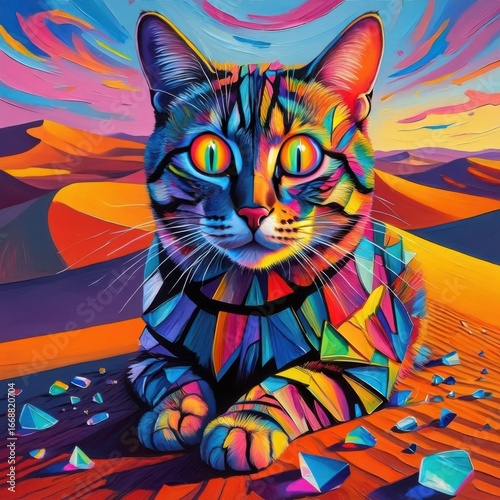 A feline of shattered glass and rainbow energy gazes across desert dunes bending into abstract forms Generative AI