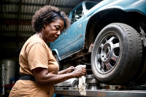 A female mechanic fixing a car or engine, displaying joy and enthusiasm in her work, making maintenance look like a delightful and enjoyable activity.