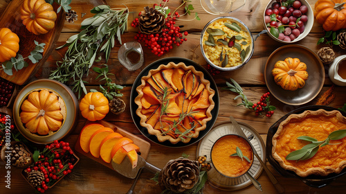 A festive autumn table spread featuring a variety of pumpkin-based dishes. The spread includes pumpkin pie, pumpkin soup, roasted pumpkin, and other seasonal dishes, complemented by decorations like s