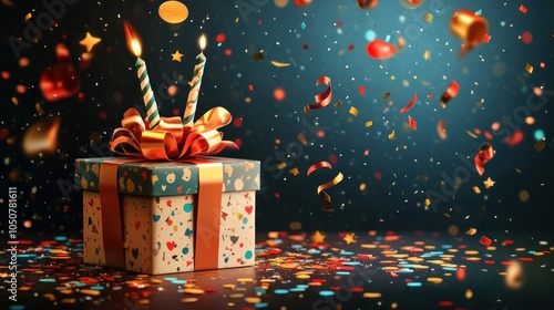 A festive birthday gift box with candles and confetti, celebrating a joyful occasion.
