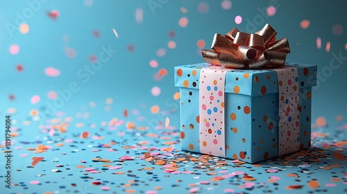 A festive blue gift box adorned with colorful confetti and a golden bow, set against a matching blue background, perfect for celebrations and joyful occasions.