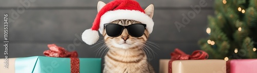 A festive cat wearing sunglasses and a Santa hat sits among colorful gifts, exuding a fun and playful holiday vibe.