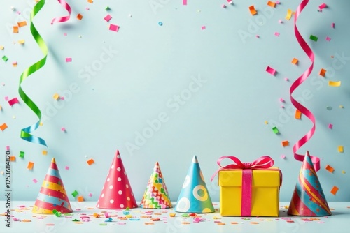 A festive celebration scene with colorful party hats and a gift, perfect for a birthday or any joyful occasion.