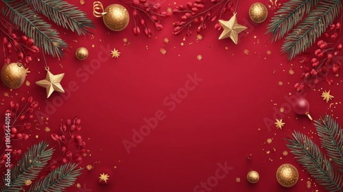 A festive Christmas background with deep red color, featuring pine branches gold ribbons around the edges, decorated with red berries, golden balls, stars, creating a warm cheerful holiday atmosphere