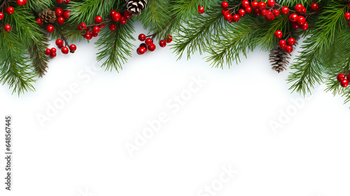 A festive Christmas border frame featuring lush green fir branches adorned with red berries, set against a white background, offering ample copy space.
